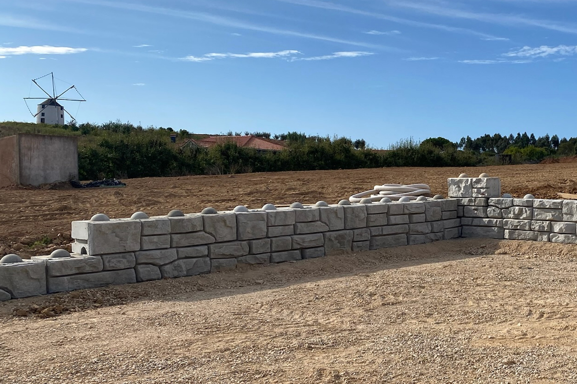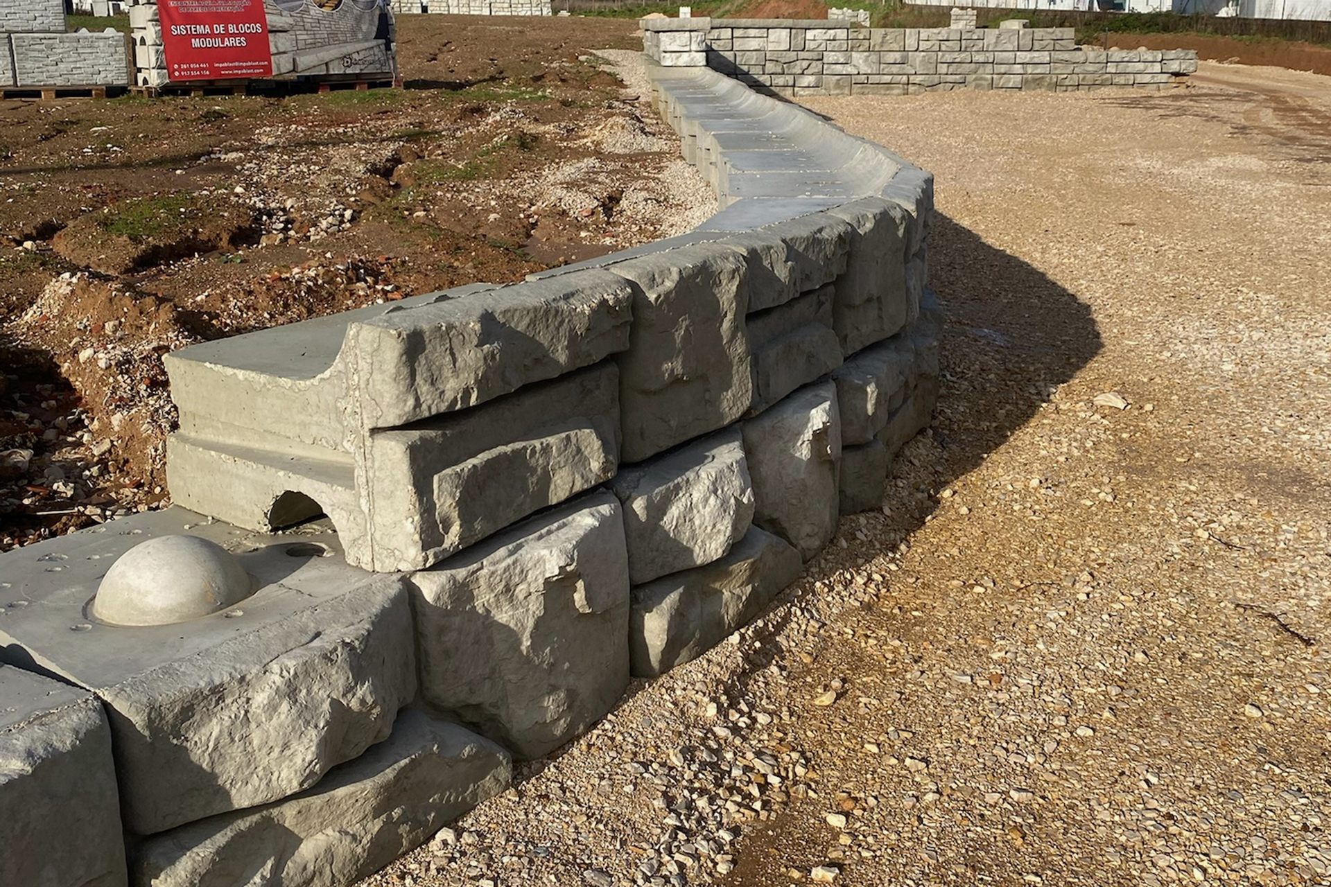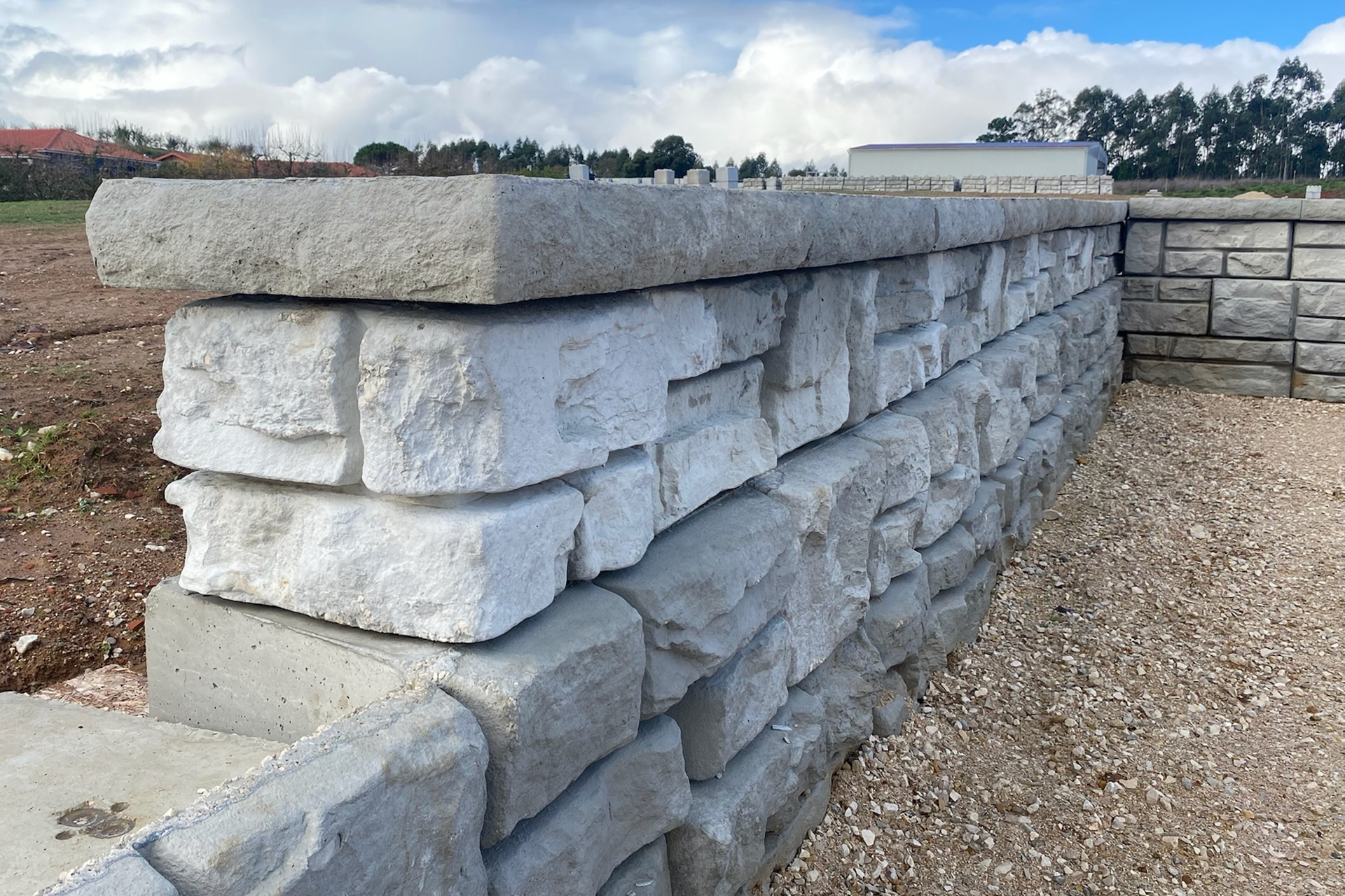 Solução funcional em blocos de betão lisos, pensada para contenção e aplicações técnicas.
